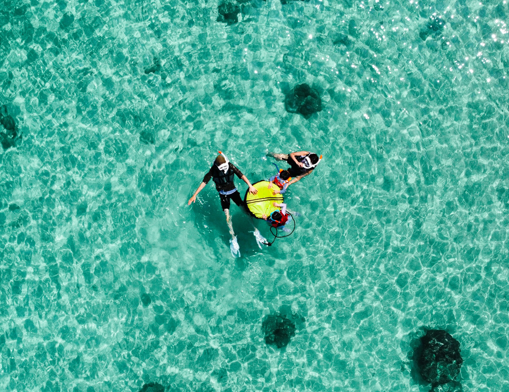 1歳半と5歳のお子様どちらも、浮き輪をご用意しておりますので安心してご参加いただけます。また、「タコメガネ(箱型の海中観察メガネ)」でお子様も海中の様子をのぞきながら楽しむことができます。保護者の方と一緒に海に入りますので、安全面にも配慮しております。