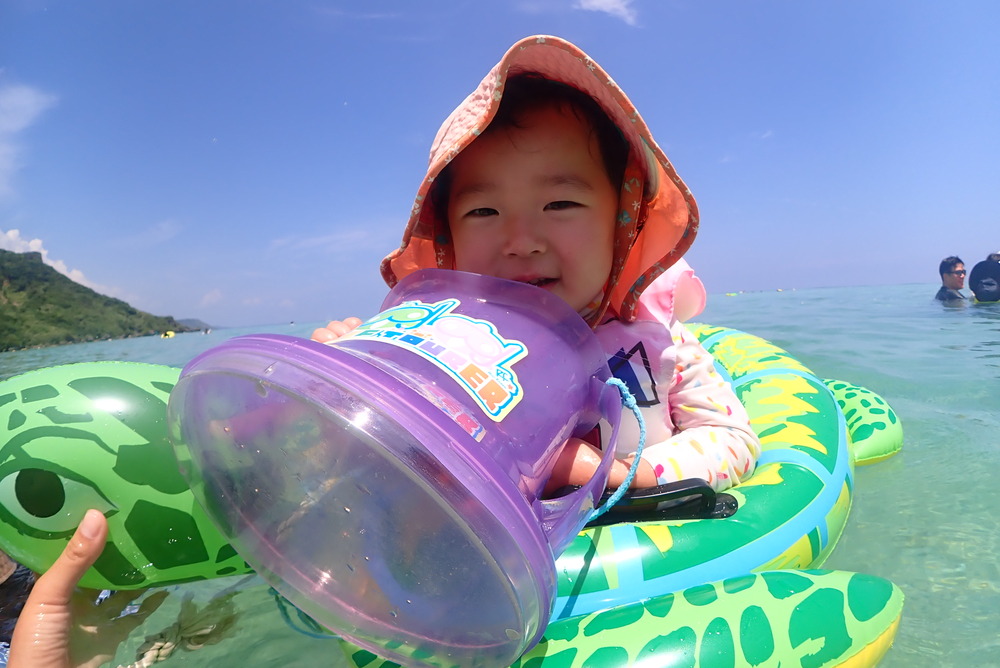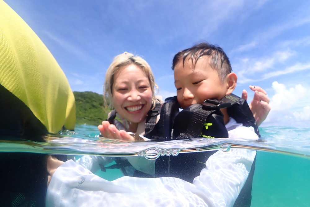 シュノーケルマスクが難しい、海に顔をつけられない小さなお子様は浮き輪の上になって頂き引っ張っていき、浮き輪の上から箱メガネで覗いてお楽しみ頂いております。また浮き輪やその他機材もこちらでご用意しておりますのでご安心下さいませ。