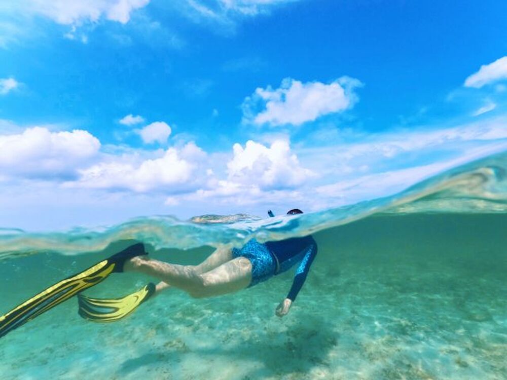ハテの浜にて、遊泳区域内でのスノーケリングやエメラルドブルーの海を眺めながらの浜散策にお連れいたします。スノーケリング初心者の方でも、基本から懇切丁寧にお教えします。