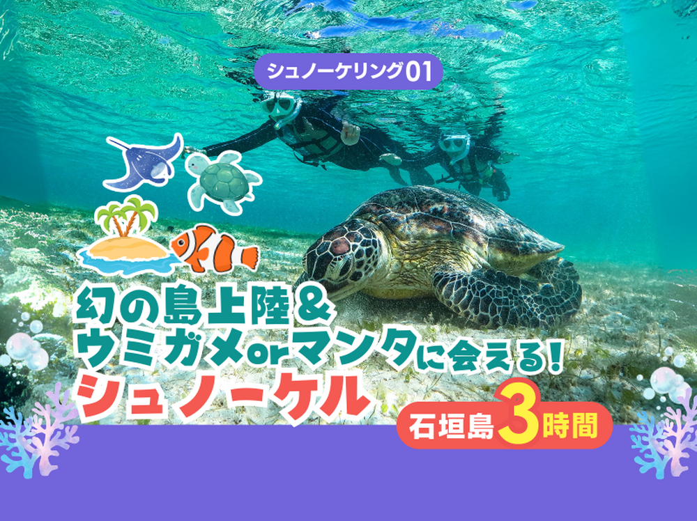 【石垣島|シュノーケル・幻の島|約3時間・半日】ウミガメorマンタと泳ぐ!幻の島上陸シュノーケリング♪GoPro無料レンタルあり!無料送迎&写真付き