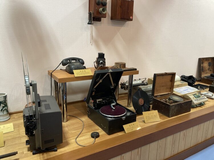 さらには蓄音機とレコードも。当時の家電が展示されていて、よく見ると黒電話はダイヤルもプッシュボタンもないタイプ。昭和初期から戦後まで使用されたようで「交換台を置き島内各所要間の連絡に大いに役立った」とのこと。