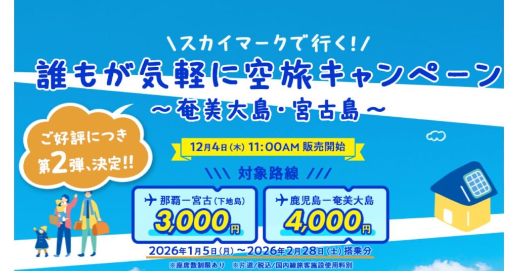 スカイマークが、宮古(下地島)行きの便を対象にした「誰もが気軽に空旅キャンペーン」の第2弾を実施。
